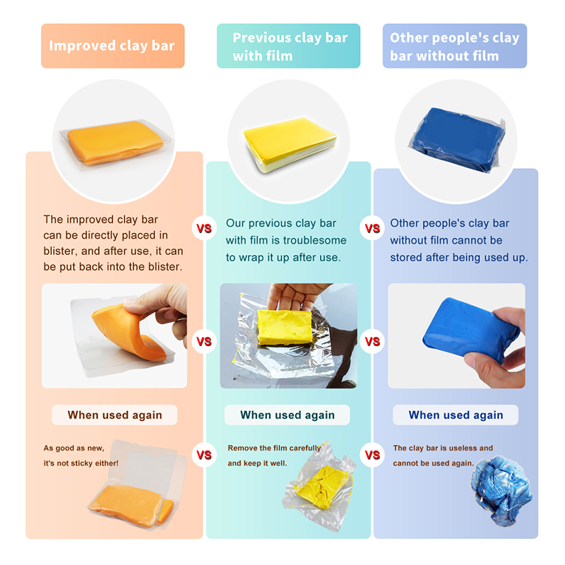 改良粘土棒可直接放入吸塑盒中,使用后可放回泡罩内。当再次使用时,它和新的一样好,也不粘包装盒。