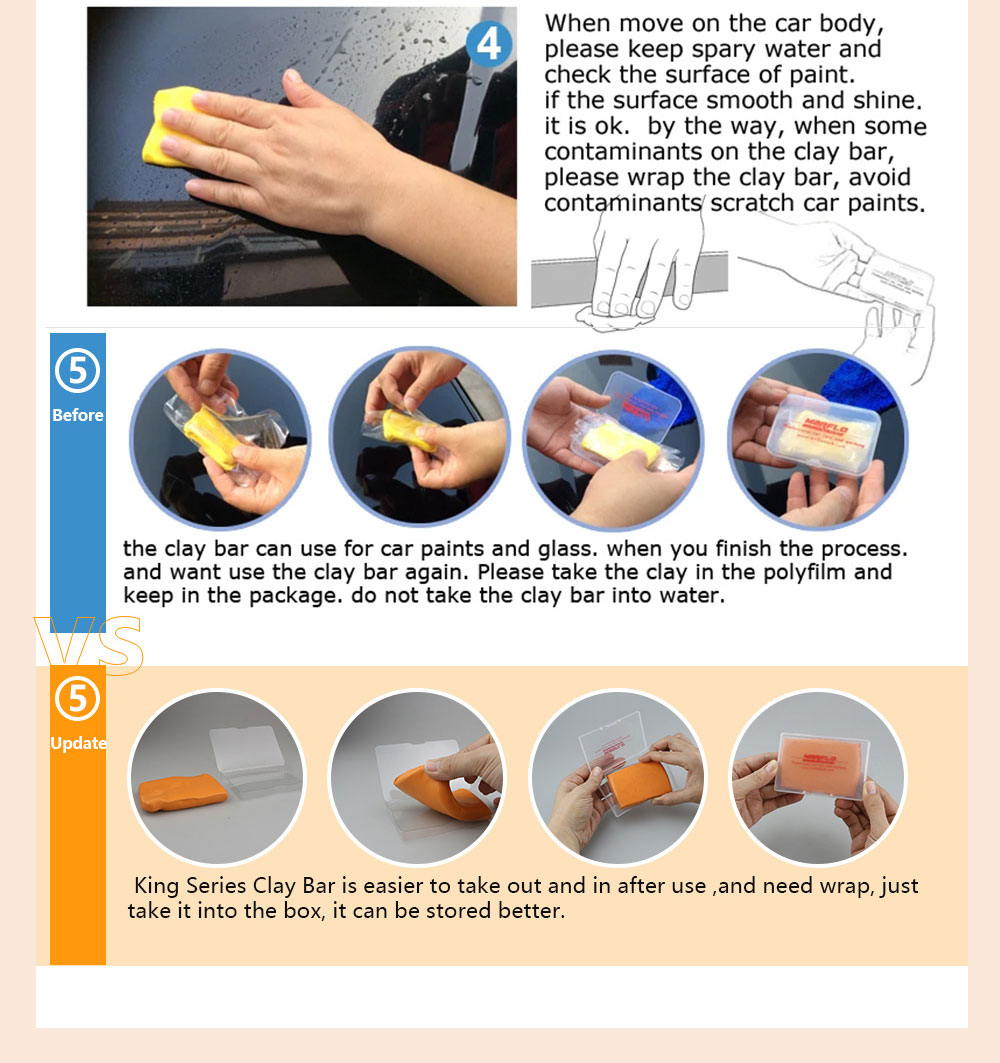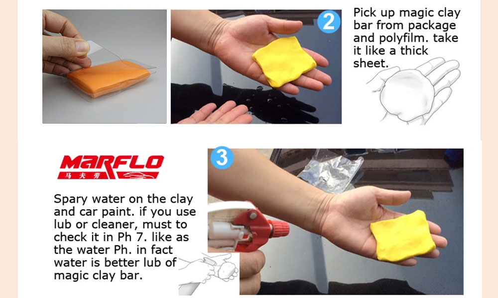 5、粘土条可用于汽车油漆和玻璃。当你完成这个过程,请把粘土包在吸塑盒里,再放PP包装里。不要将粘土棒放入水中。