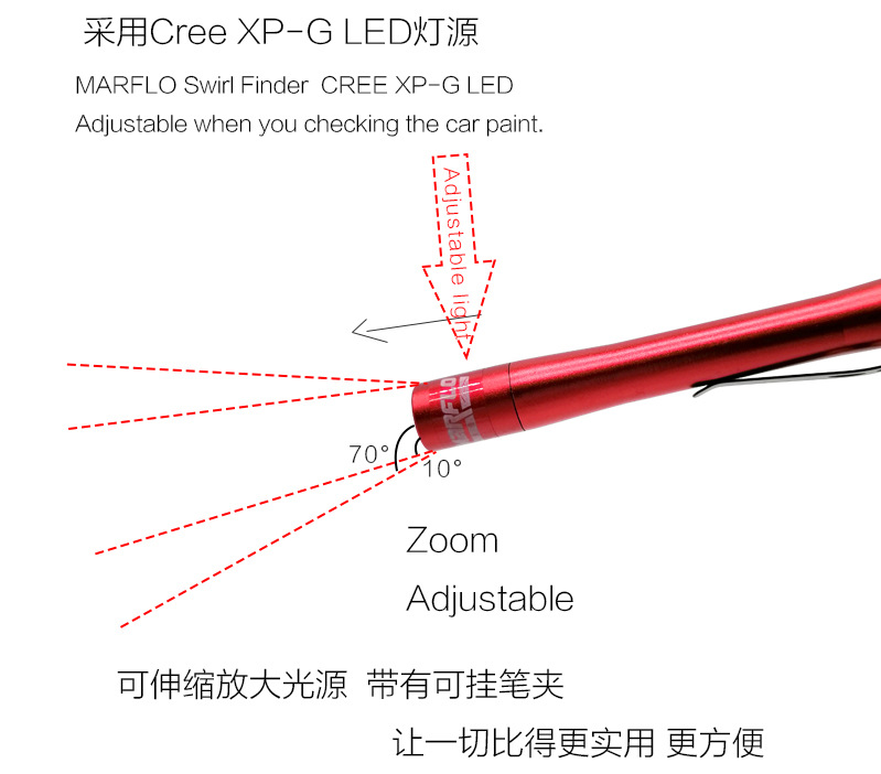 | 捕纹灯采用CREE XP-G LED灯源,当你在检查车漆时,可通过调节灯头来调节光源大小。配有一个可挂笔夹,工作时可直接挂在衣服口袋上,使用更方便。 |