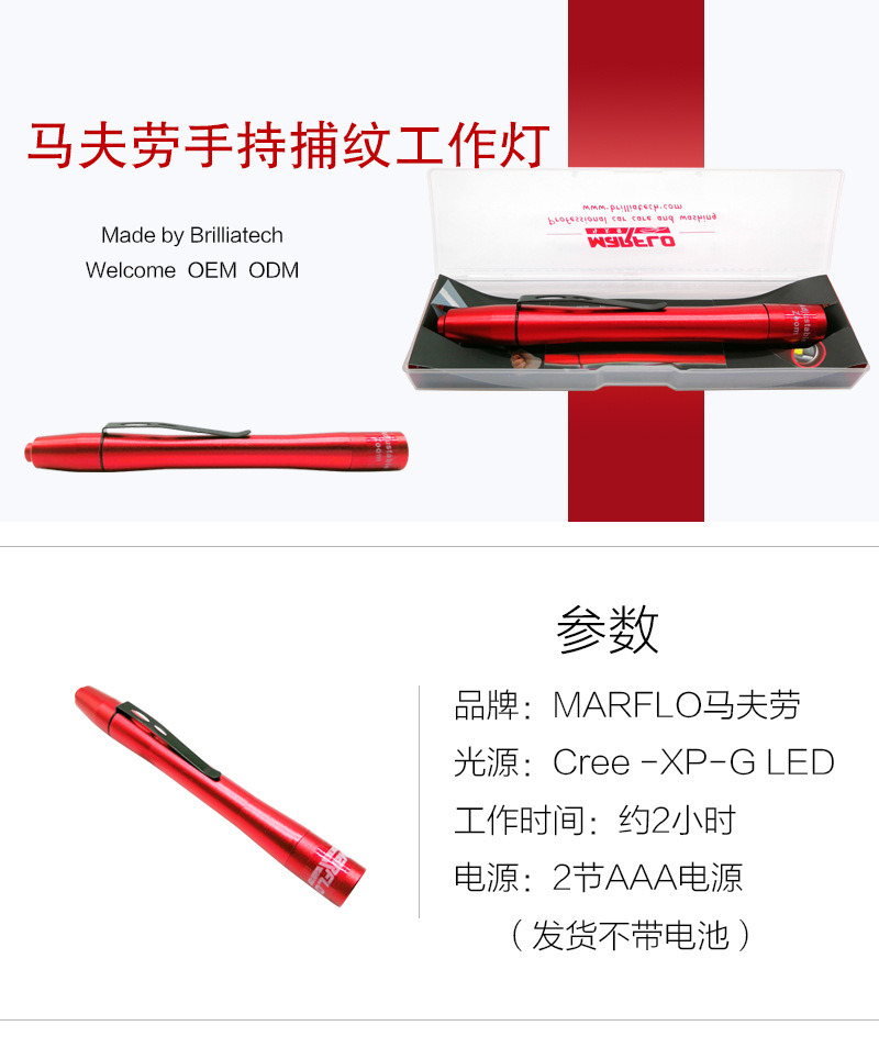 这款便携式笔式捕纹灯可以有效找出旋纹、划痕、眩光和其他漆面瑕疵。体积小、重量轻、非常易用。精美胶盒包装,CREE XP-G LED灯珠,可调焦,光照夹角10°-70°,全金属外壳,直径16mm,长148mm。亮度很高,实测捕纹效果极好。2节AAA(七号)电池供电,照明时间2小时。使用应与漆面保持20-30公分距离,并适度倾斜。
