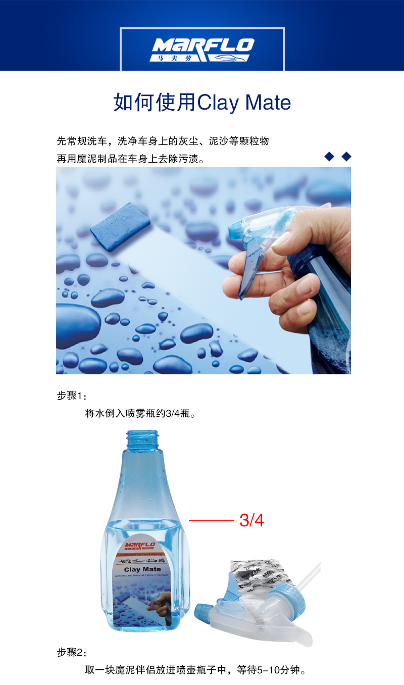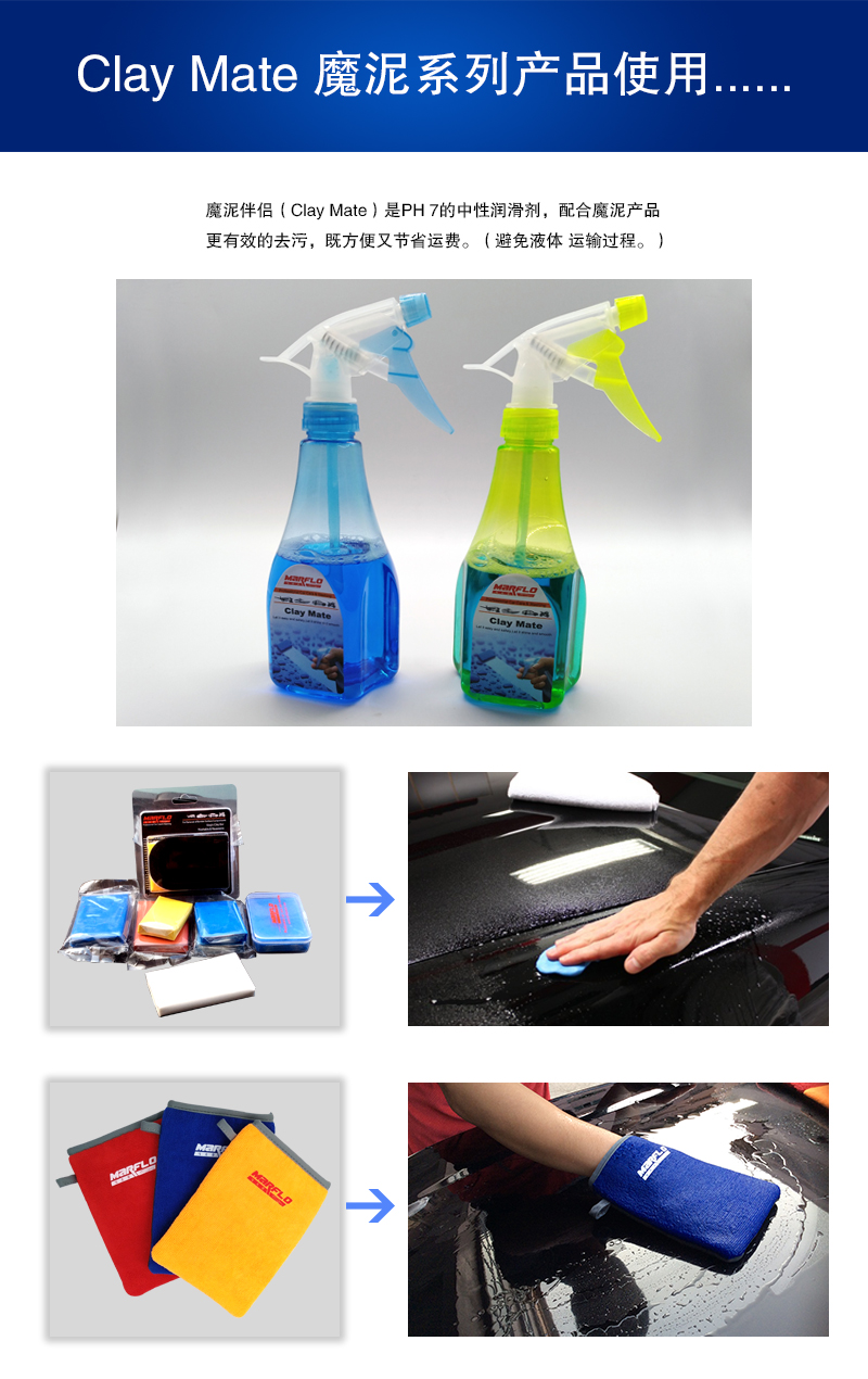使用场景:魔泥伴侣(Clay Mate)是PH 7的中性润滑剂,配合魔泥产品如魔泥洗车泥、魔泥手套、魔泥毛巾、魔泥方块、魔泥抛光盘使用,更有效的去污,既方便又节省运费。 |