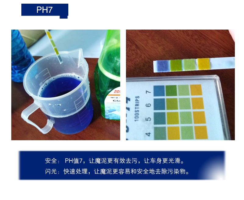 | 清洁泡腾片PH值为7,中性温和,不会对车漆产生伤害。为魔泥提供润滑,使魔泥更容易和安全地去除污染物。 |
