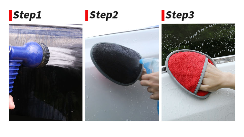 洗车步骤:1、用水把车身打湿 2、把水或者润滑液喷在擦车手套上和车身上,使擦车手套和车 身足够湿滑。 3、擦洗车身直至污渍擦洗干净,再用水把车子上的污渍和泡沫冲洗 干净为止。 |