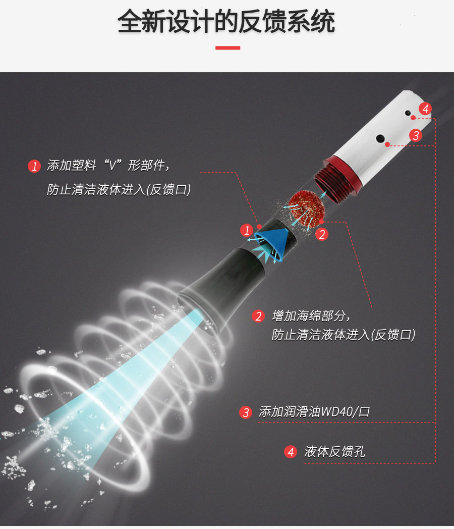 全新设计的反馈系统:1、添加塑料“V”形部件,防止清洁液体进入(反馈口) 2、增加海绵部分,防止清洁液体进入(反馈口) 3、添加润滑油WD40/口 4、液体反馈孔 |