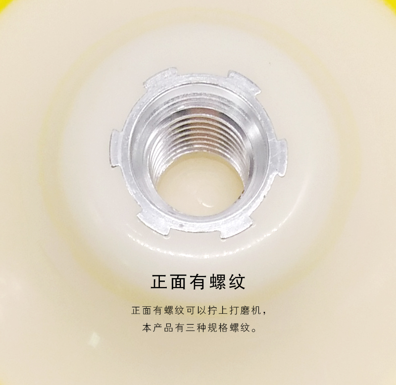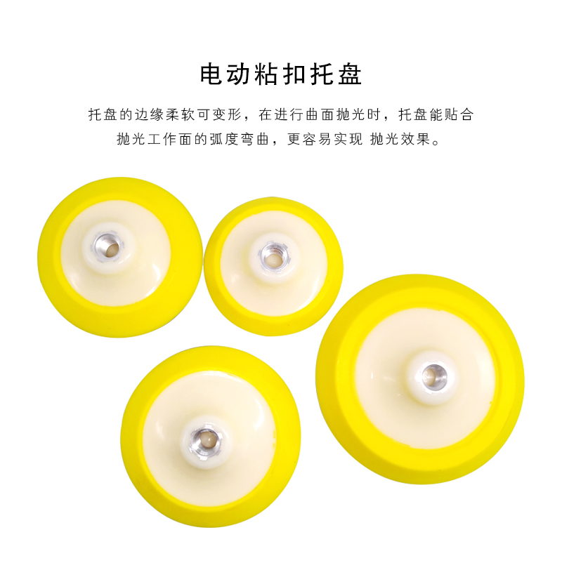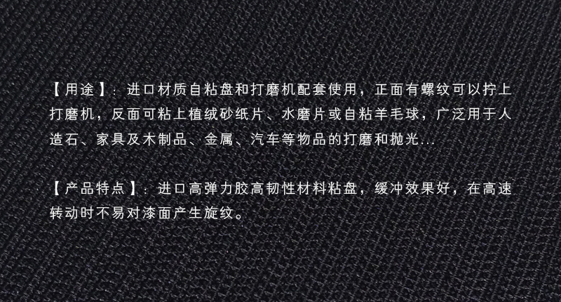 进口材质自粘盘和打磨机配套使用,正面有螺纹可以拧上打磨机,反面可粘上植绒砂纸片、水磨片或自粘羊毛球,广泛用于人造石、家具及木制品、金属、汽车等物品的打磨和抛光