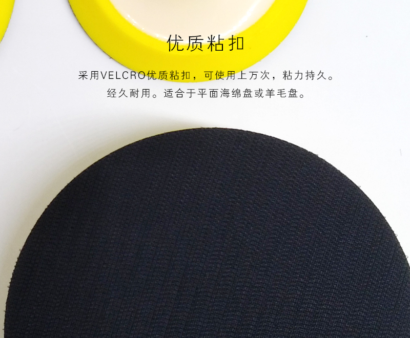 1、采用VELCRO优质粘扣,可使用上万次,粘力持久。经久耐用。适合于平面海绵盘或羊毛盘。