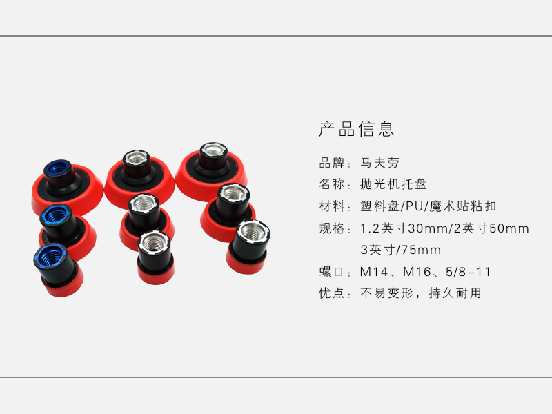 品牌:马夫劳 材质:塑料盘、PU、魔术贴粘扣 尺寸:3cm(1.2寸)、5cm(2寸)、7.5cm(3寸) 颜色:红色 螺纹:M14、M16、5/8-11 包装:PP盒 功能:汽车美容、汽车抛光、汽车打磨 |