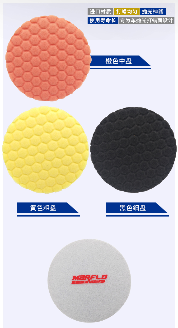 三种颜色,三种不同切削力海绵。黄色是粗切削力海绵盘,橙色是中切削力海绵盘,黑色是细切削力海绵盘。根据划痕来选择适合的抛光海绵,选择粗中细三款抛光盘海绵.