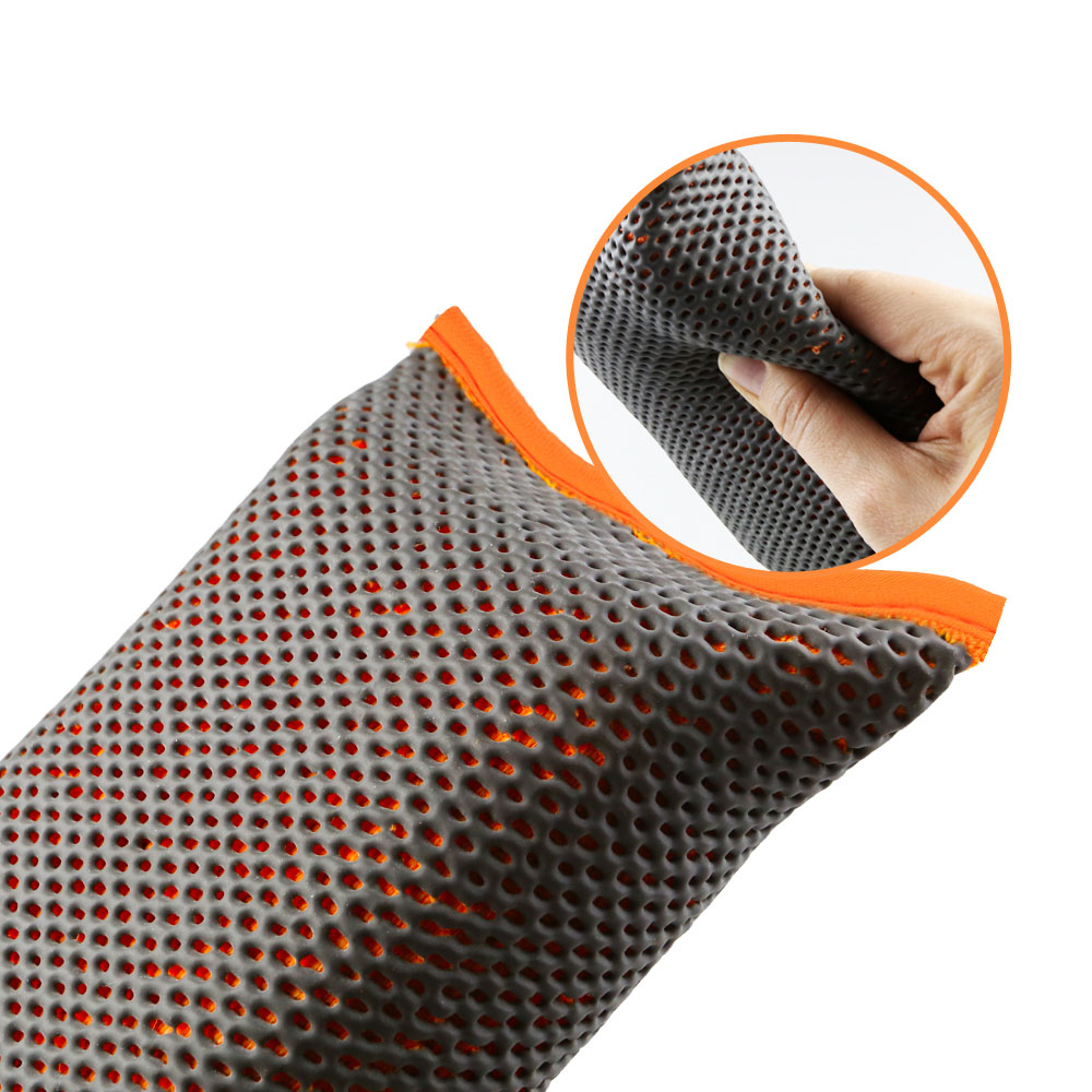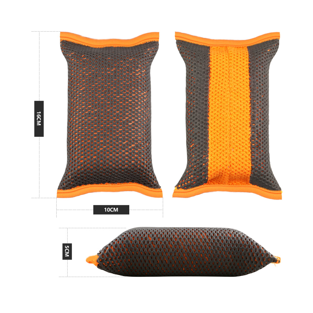 全包裹式纤维布,整齐的内扣缝边,减少魔泥方块与车漆的摩擦,减小划痕。网格状的设计,让洗出的污渍随着水流留再孔内,减少划痕。